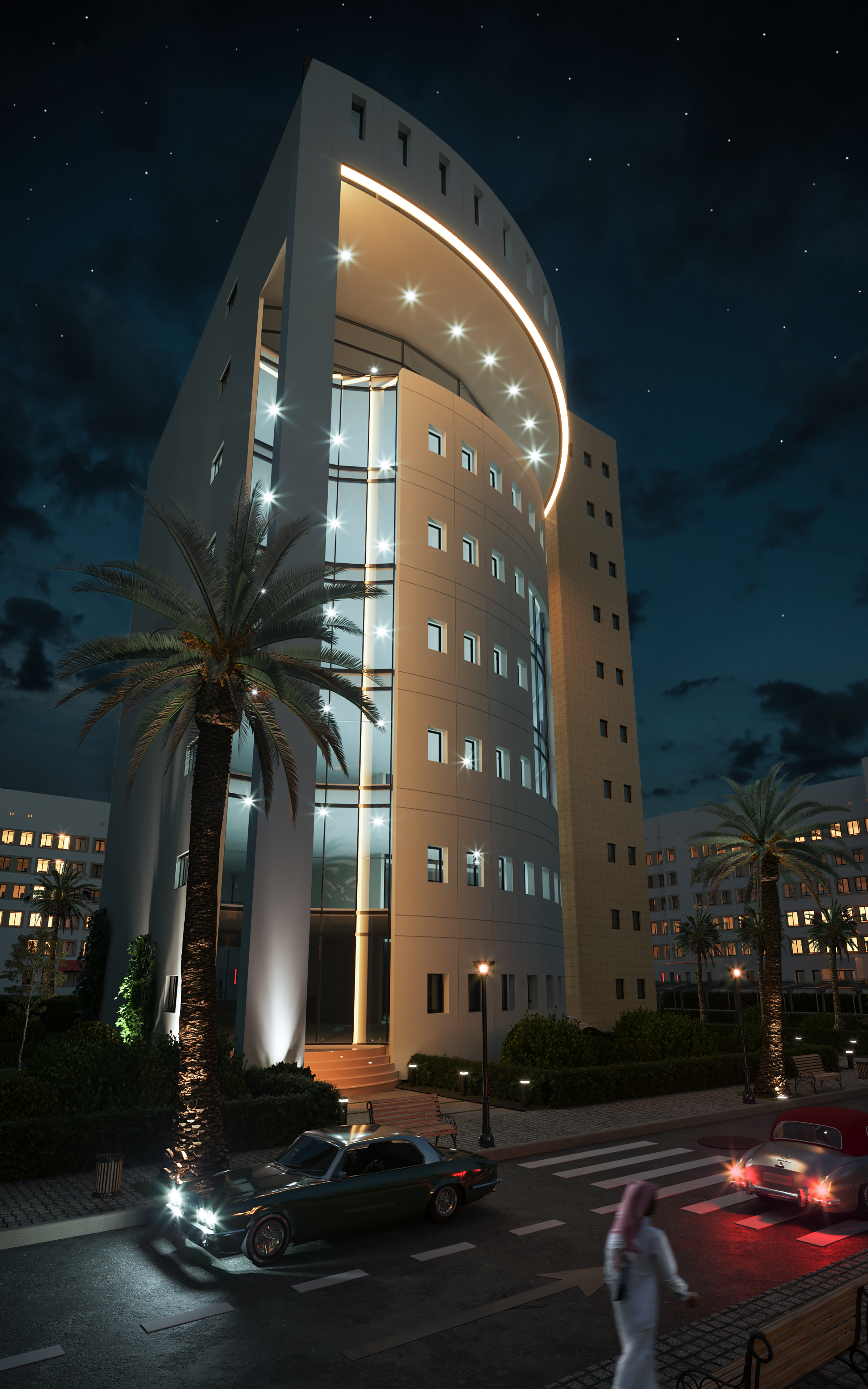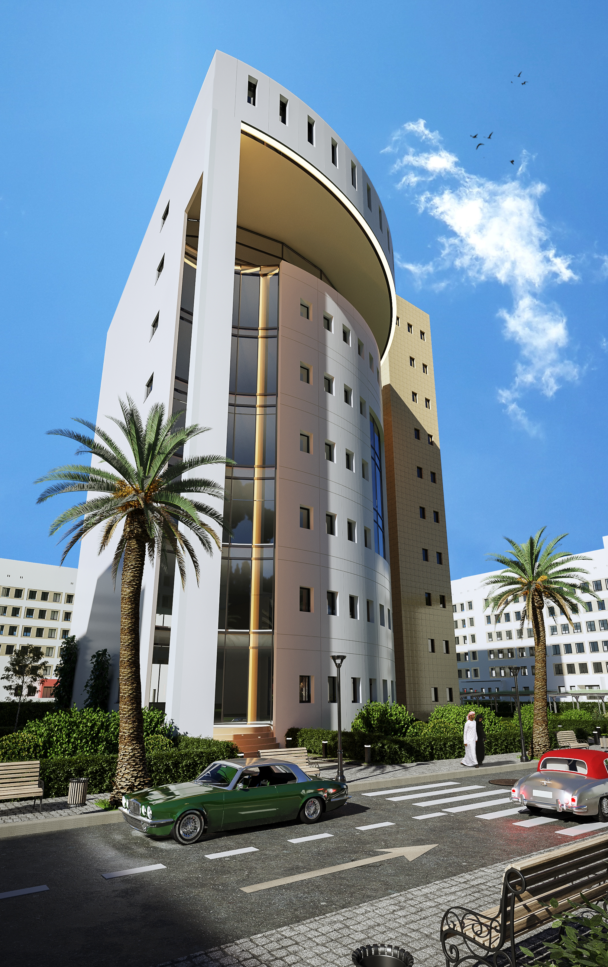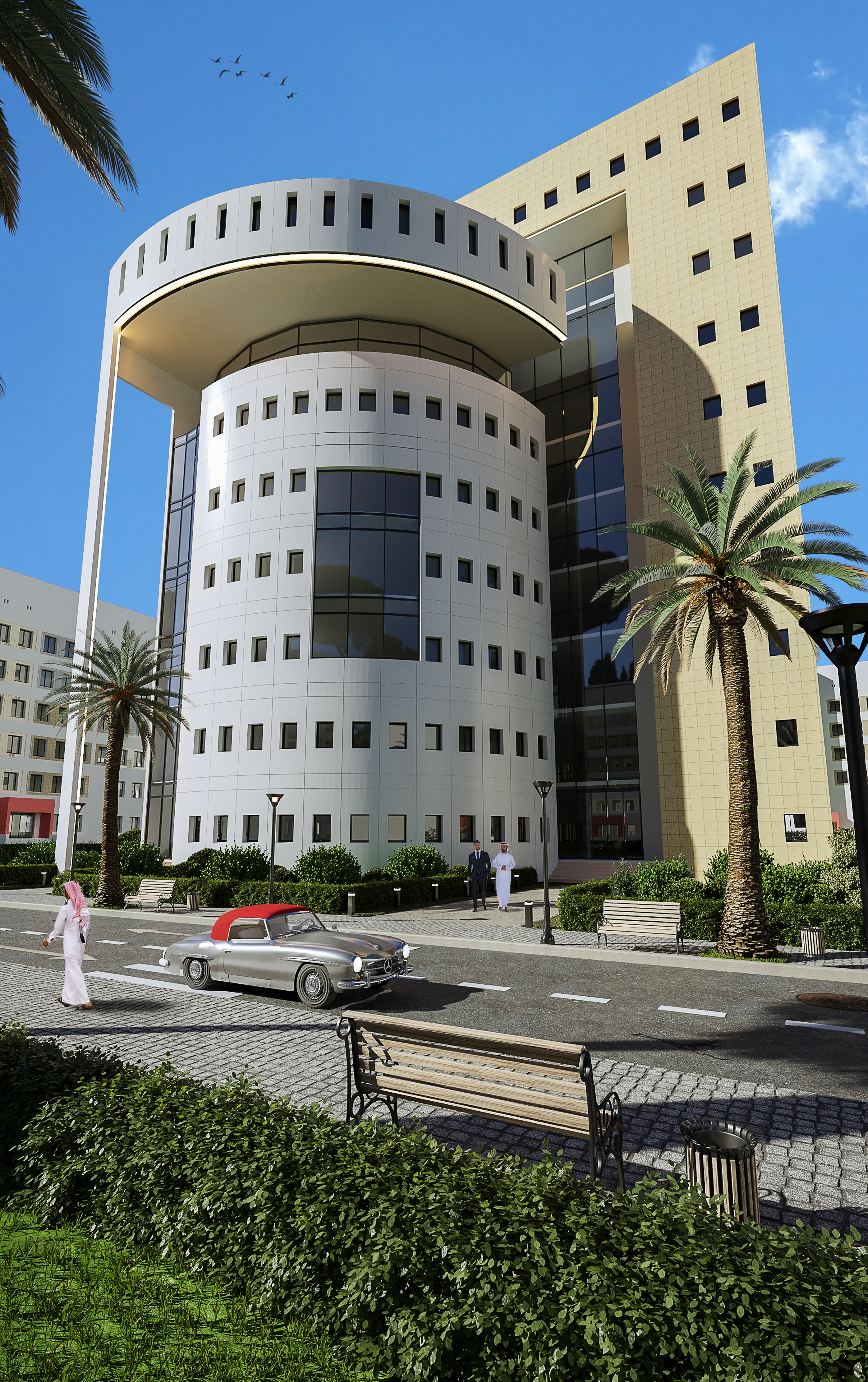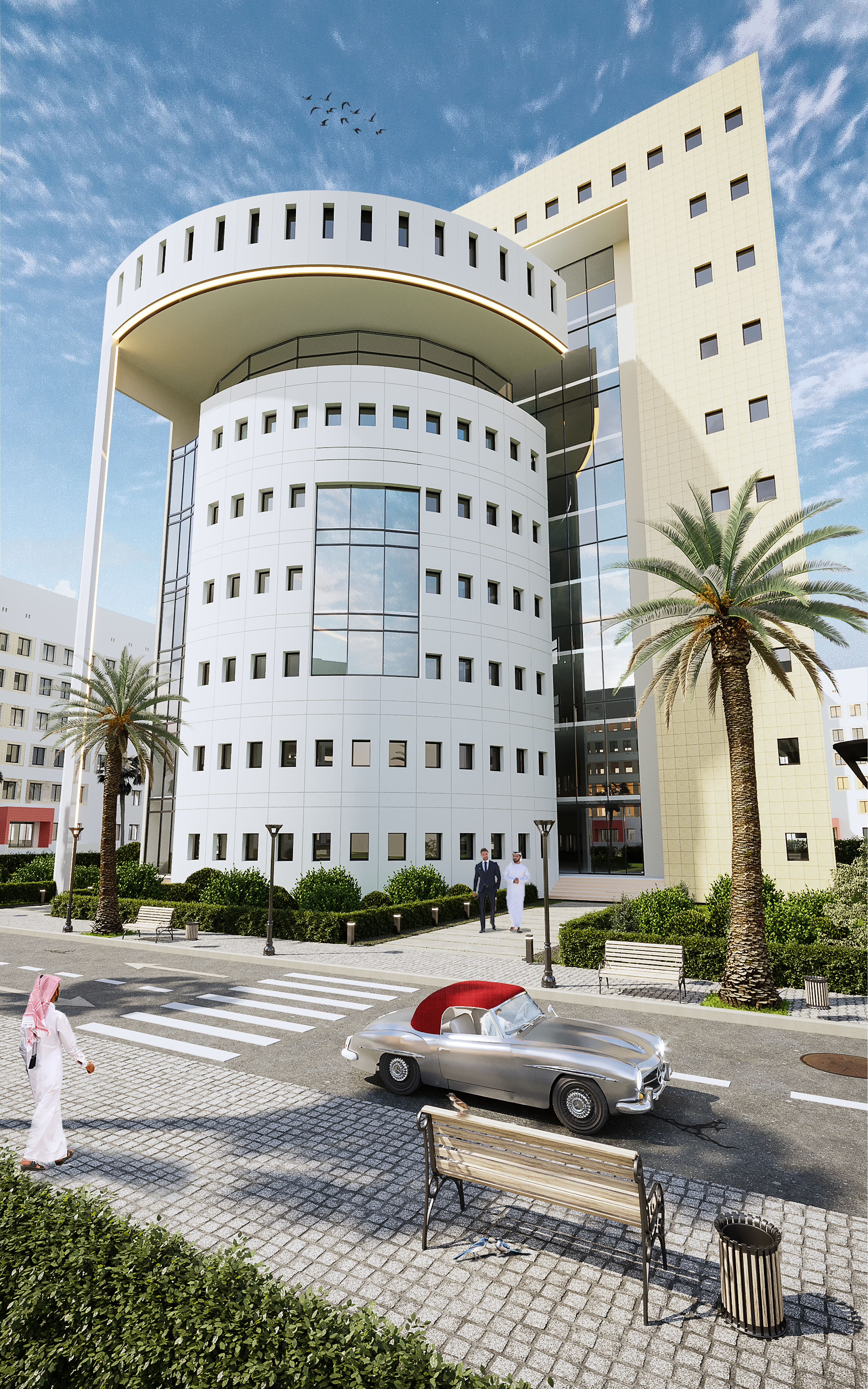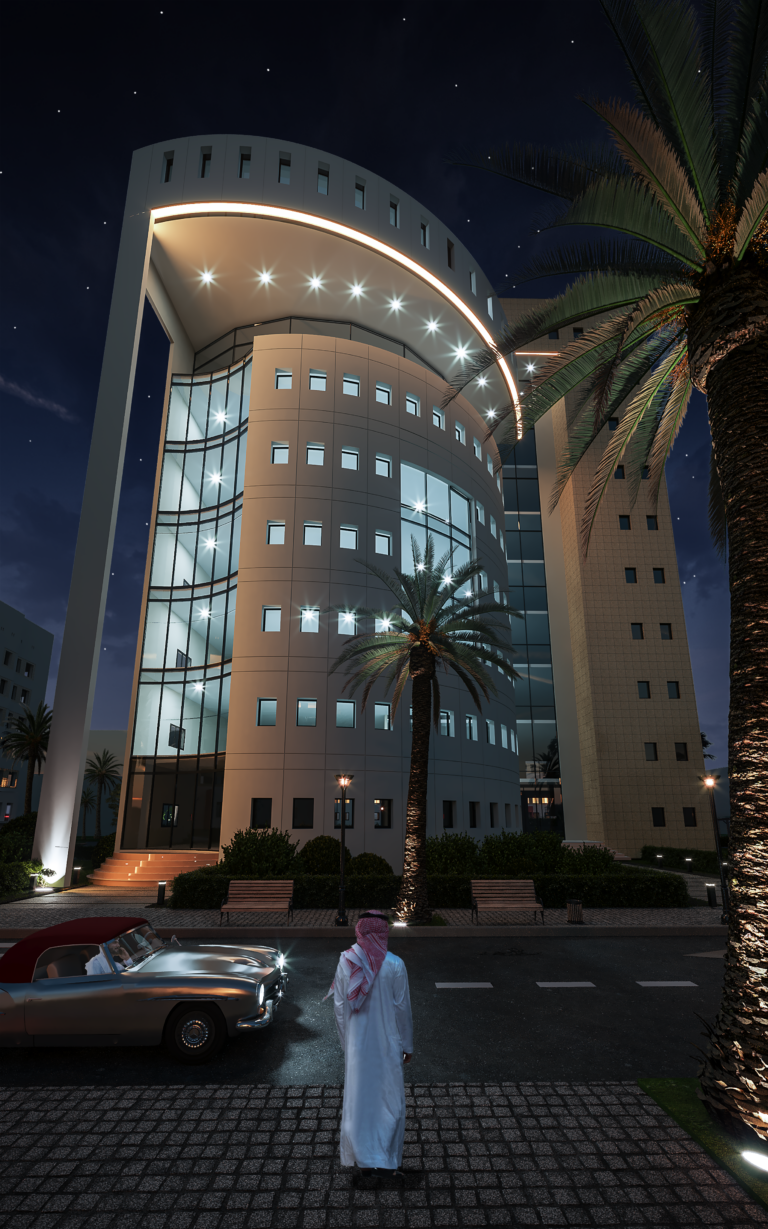 The main building of Basamah Trading is designed to embody both dynamism and stability, reflecting the company’s significant role in the trade industry. Its distinctive topography and architectural details create a strong presence in the urban landscape. The design seamlessly blends strength with flexibility, symbolizing movement and innovation while highlighting the company’s influence and vision.